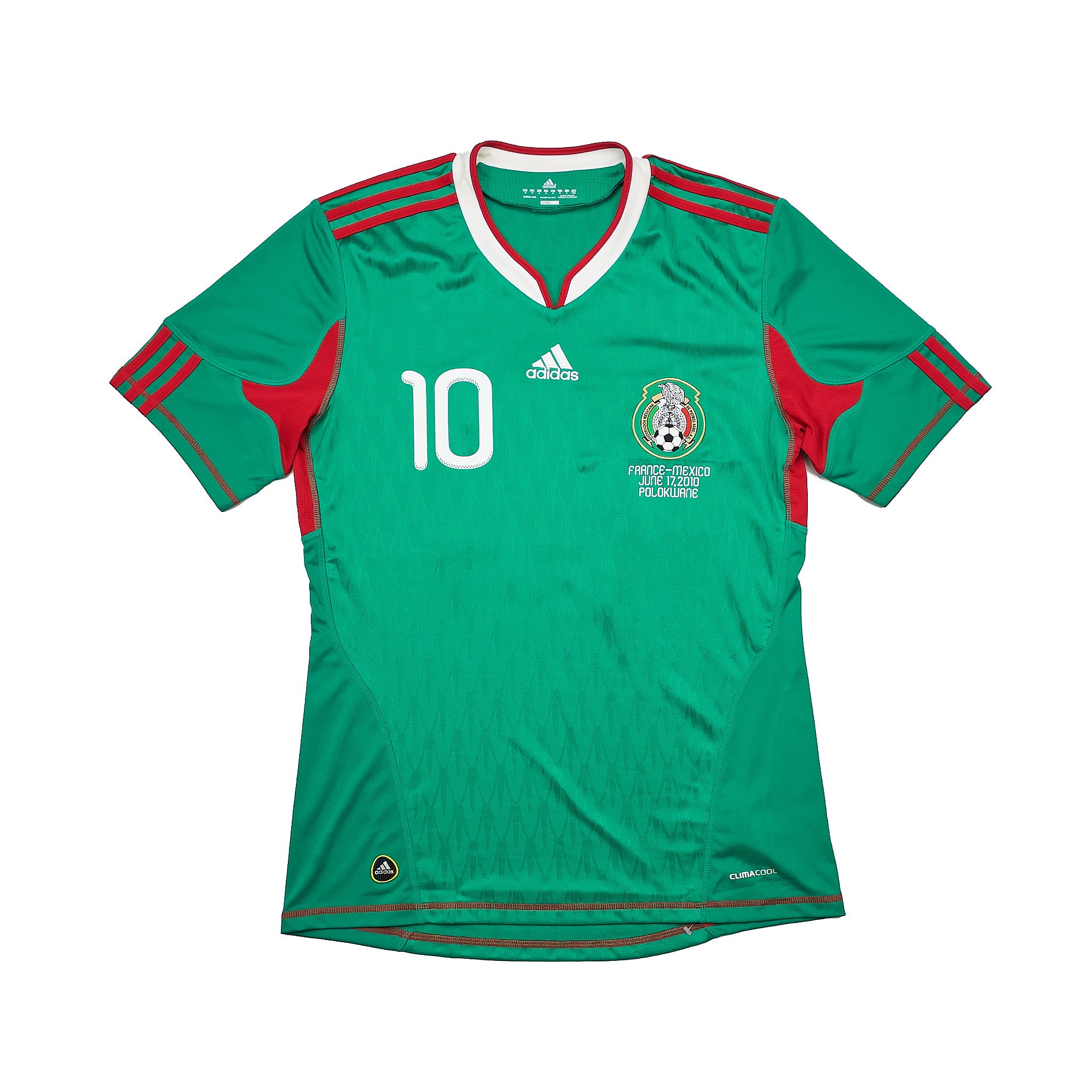 INFO - France Vs Mexico 2010 June 17th 2010 detail to the chest. The 2010 Mexico Adidas Home Shirt stands out as one of the most striking designs in the national team’s history. Worn during the 2010 FIFA World Cup in South Africa, this sleek Mexico football jersey combines national pride with contemporary performance technology. Featuring a rich green base accented by vibrant red and white details, with adidas' Climacool technology built in, it was designed for high performance and comfort, both on the pitch and in the stands. Worn by a talented generation of players including Rafael Márquez, Giovani dos Santos, and Javier ‘Chicharito’ Hernández, this shirt is forever linked to Mexico’s dramatic tournament run; including a memorable opening match against hosts South Africa and a historic victory over France. Whether you’re a fan of World Cup heritage, a collector of Mexico football shirts, or simply love iconic design, this jersey is a must-have piece for any football shirt collector.