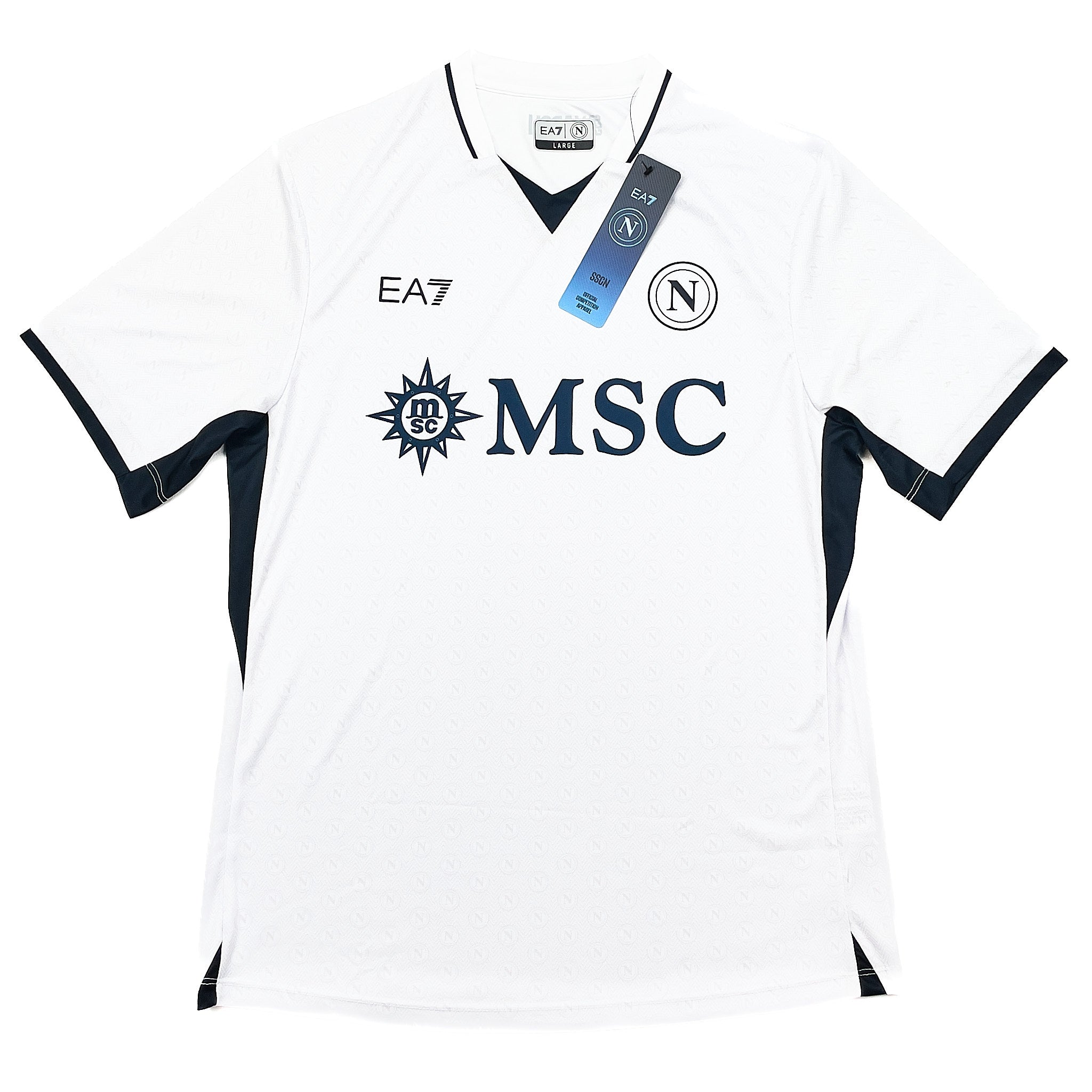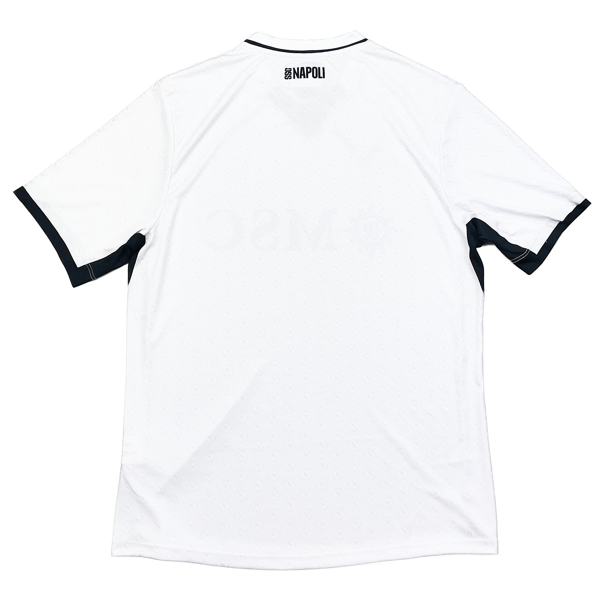 INFO - The official Serie A champions SSC Napoli 2024/25 stadium away shirt by EA7. Featuring a sleek V-neck with retro detailing. Contrasting Armani white & black accents with a lightweight 100% polyester construction ensures comfort and mobility on and off the pitch.