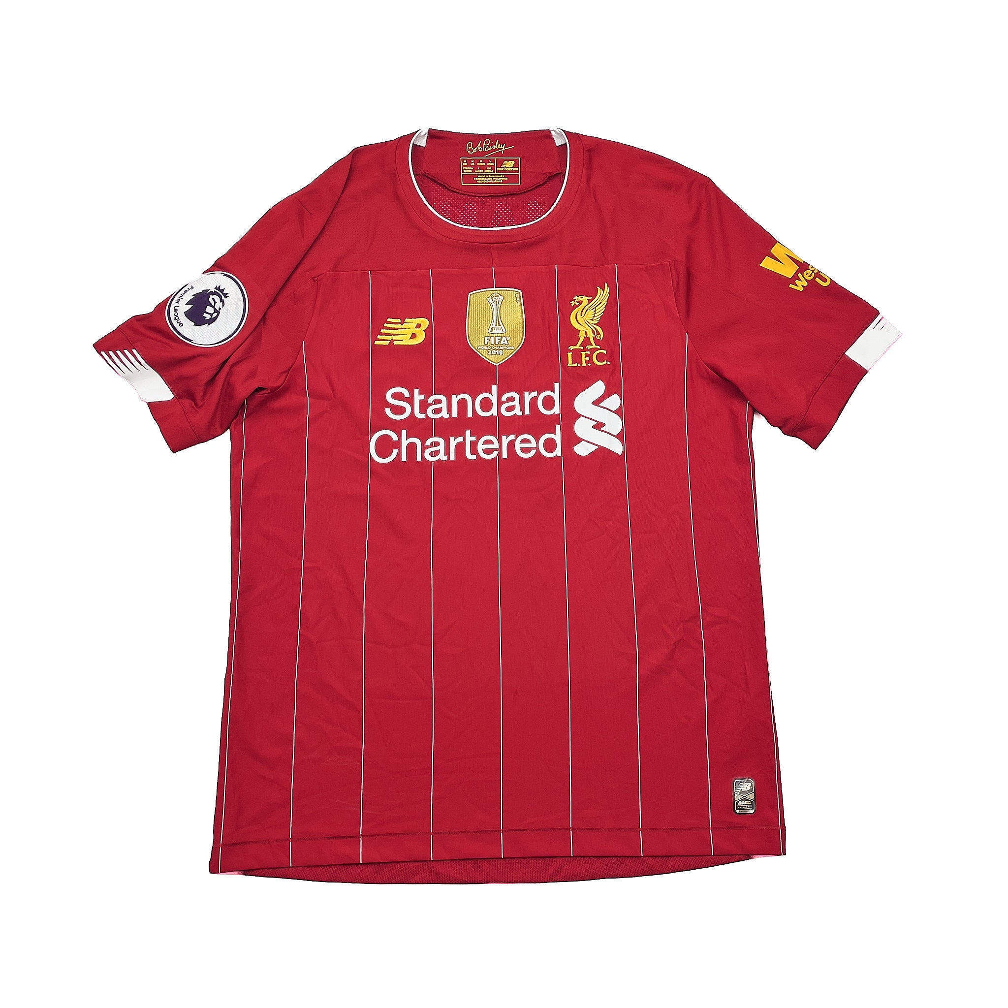 INFO - Premier League patch to the right sleeve, 2019 Gold fifa world champions patch to the chest